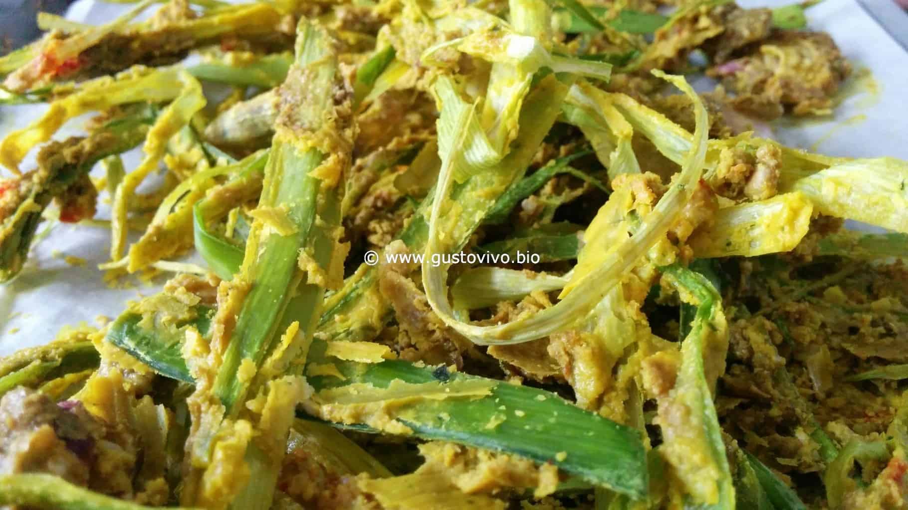 Preparare le Verdure per le chips di accompagnamento: Pulire il cavolo nero, togliendo le nervature delle foglie, tagliare il porro a listelli, la cipolla a fette, il peperone sempre a listelli, e passarli nella pastella e poi metterli nell’essiccatore sempre per 12 ore.